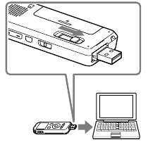 - Плъзнете USB DIRECT плъзгащия лост на гърба на IC recorder-а и поставете USB конектора в USB порта на работещ компютър.