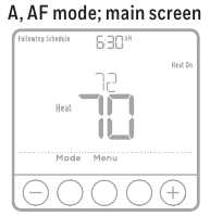 AF режим (и температура на въздуха, и температура на пода): Контролира и показва температурата на околния въздух, както и поддържа температурата на пода в рамките на желаните граници на температурата на пода, използвайки външен сензор за температура на пода. Задаването на минималните и максималните граници на температурата на пода се извършва от вашия местен специалист по отопление и е начин да подобрите комфорта и да защитите подовата си настилка едновременно.