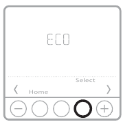 за да включите (ON) или изключите (OFF) Eco (Еко) режим. Натиснете Select (Избор). NOTE: (ЗАБЕЛЕЖКА:) Eco (Еко) режимът е наличен в менюто на термостата само ако термостатът е конфигуриран за режим на управление AF и е деактивиран (OFF) по подразбиране.