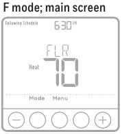 В зависимост от това за кой режим на контрол на температурата е конфигуриран термостатът, вие ще програмирате или температурата на въздуха, или температурата на пода. Температурата на пода ще бъде посочена с текст FLR над действителната стойност на температурата.