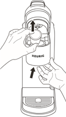 За да извадите поставката за K-Cup® капсули от кафемашината, повдигнете дръжката и хванете горната част на поставката за K-Cup® капсули с една ръка, докато натискате нагоре долната част на поставката за K-Cup® капсули отдолу с другата, докато се освободи. След почистване подравнете поставката за K-Cup® капсули с отвора, като използвате двете предни ребра като водач, и я щракнете на място отгоре.