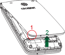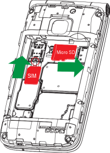 - Поставете microSD картата (не е включена) в слота "microSD" отдясно, като се уверите, че златните контакти са надолу, а плоският ръб е нагоре. Закачете отново задния капак на телефона