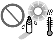 | Не поставяйте и не съхранявайте продукта на открито, близо до прекомерна мръсотия или прах, вода, източници на топлина или на места, подложени на удари, вибрации, висока температура или влажност. | ![]() |