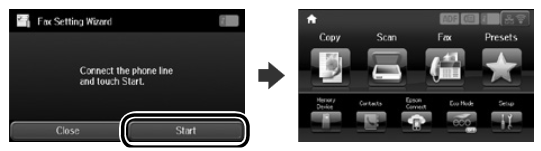 - Когато се покаже екрана на съветника за настройка на факс, докоснете start (старт), за да конфигурирате минималните настройки за функциите на факса. Ако не искате да ги конфигурирате сега, затворете екрана за настройка на факса. Показва се началният екран и принтерът е готов за печат.