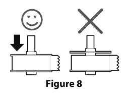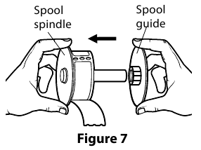 - Umístěte vodítko cívky na pravou stranu cívky a pevně přitlačte vodítko ke straně role štítků, aby mezi rolí a cívkou nebyla žádná mezera. Viz obrázek 8.