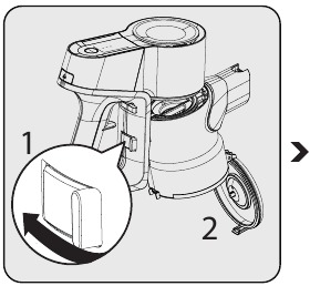 - Pro důkladné čištění filtrů vyjměte nádobu na prach stisknutím tlačítka na levé straně.
