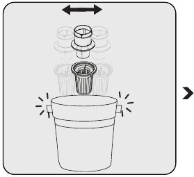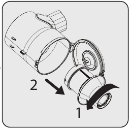 - Chcete-li vložit plastový filtr, nejprve umístěte plastový filtr (1), poté jej otočte ve směru hodinových ručiček, abyste jej zajistili (2).