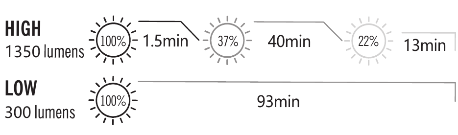- Když je napětí baterie příliš nízké, lze aktivovat pouze režim Low (nízký) s 300 lumeny.