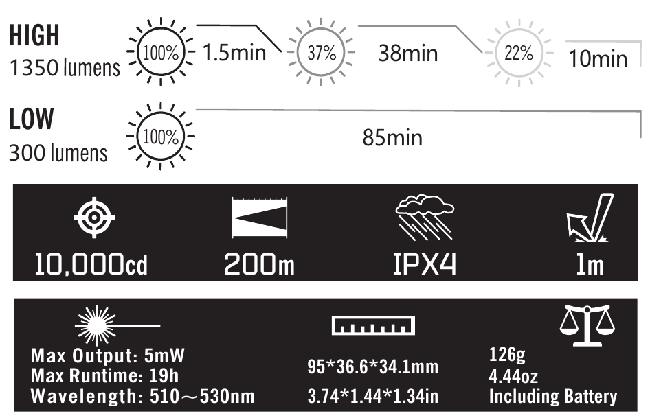 - LED světlo bude pracovat jednu minutu v režimu maximálního výkonu a postupně klesne na 500 lumenů během 0,5 minuty.