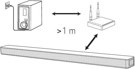 Udržujte sound bar a subwoofer v dostatečné vzdálenosti od zařízení (např. bezdrátový router, mikrovlnná trouba atd.) více než 1 m, abyste zabránili bezdrátovému rušení.