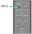 - Stiskněte tlačítko INPUT na dálkovém ovladači systému pro přepnutí na vstup HDMI. Na displeji na předním panelu reproduktoru Bar Speaker se zobrazí [HDMI] a zvuk z připojeného zařízení je vysílán ze systému.