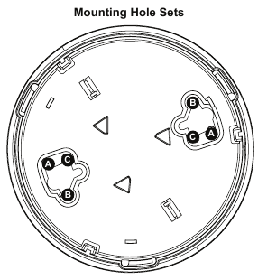 - Hold monteringsbeslaget mod loftet (eller væggen), så de to klynger af universelle monteringshuller er justeret omtrent kl. 9:00 og 3:00. Se billede. Vælg et af de tre sæt huller, der vises, A, B eller C (se billede), og tegn rundt om et af sættene. Sørg for at vælge en top- og bundslids på modsatte sider, så du kan dreje det universelle monteringsbeslag på plads senere. Dette vil gøre det lettere i fremtiden at fjerne monteringsbeslaget uden at fjerne skruerne helt.
