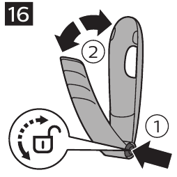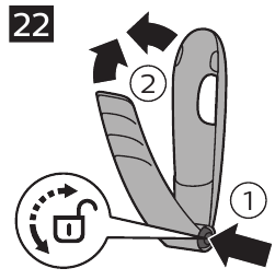 - For at lukke rygbarberingsudstyret, tryk og hold udløserknappen (1) nede, og skub håndtaget mod holderen (2) (Fig. 22).