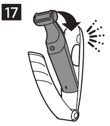 - Anbring bunden af produktet i den nederste del af rygbarberingsudstyret. Tryk derefter toppen mod den øverste del af holderen, indtil den låses på plads med et klik (Fig. 17).