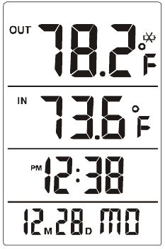 Modtagerenheden har et tydeligt, letlæseligt display, der viser indendørs/udendørs temperatur, tid, dato, måned og ugedag. Den er i stand til at modtage og vise målinger fra den eksterne sensor.