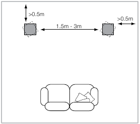 Til at begynde med skal højttalerne placeres mellem 1,5 m og 3 m fra hinanden i to hjørner af en ligesidet trekant, der fuldendes af lytteområdet i det tredje hjørne. Højttalerne skal placeres mindst 0,5 m væk fra bagvæggen og eventuelle sidevægge (som vist på illustrationen nedenfor).