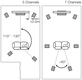 Hvis højttalerne skal bruges til frontkanalerne i et hjemmebiografsystem, skal de placeres tættere sammen end til 2-kanals lyd, fordi surroundkanalerne har tendens til at udvide billedet. Placering af højttalerne inden for ca. 0,5 m fra siderne af skærmen vil også hjælpe med at holde lydbilledet i skala med det visuelle billede. Som med konventionel stereoplacering skal højttalerne ideelt set være mindst 0,5 m væk fra eventuelle sidevægge.