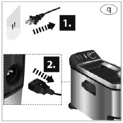 - ALVORLIGE FORBRÆNDINGER FRA VARM OLIE KAN OPSTÅ, HVIS EN FRITUREGRYDE TRÆKKES NED FRA EN KØKKENBORD. LAD IKKE LEDNINGEN HÆNGE UD OVER KANTEN AF BORDET, HVOR DEN KAN GRABBES AF BØRN ELLER BLIVE FILTRET IND I BRUGEREN.