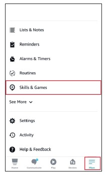 - Åbn Amazon Alexa appen. Tryk derefter på More (Mere) og vælg Skills & Games (Færdigheder og Spil).