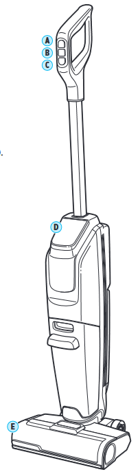 Tryk på (C) for at tænde. Vælg tilstand med (B). Se valget på (D). Når du bruger begge tilstande i én rengøringssession, skal du starte med Power Vac Mode til tørrengøring og derefter skifte til Power Mop Mode.