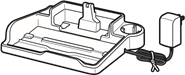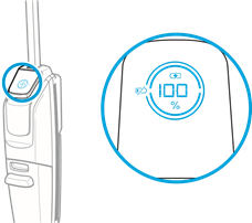 | 1. Sæt håndtaget godt fast i maskinens kabinet, indtil det klikker. | 2. Sæt opladerkablet i stikkontakten. | 3. Placer maskinen på bakken, og sørg for, at opladningsikonet lyser. Lad den oplade i 4 timer, eller indtil batteriet når 100 % opladning. | |