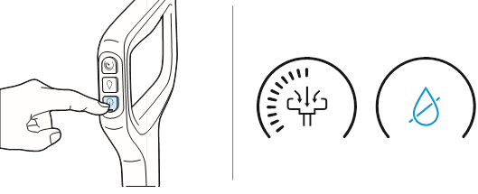 | 4. Tryk på tænd/sluk-knappen for at tænde maskinen. Læn maskinen tilbage for at starte rengøringen. Vend tilbage til opretstående position for at stoppe. | 5. Tryk på rengøringstilstandsknappen for at skifte til Power Mop-tilstand. Vent 10-15 sekunder, så maskinen kan gennemvæde børsterullen helt. | 6. For at opnå de bedste resultater skal du bevæge maskinen fremad for at gøre gulvet vådt og bagud for at trække vand ud. |