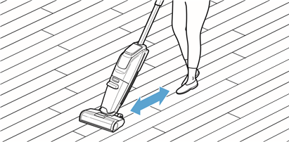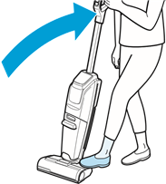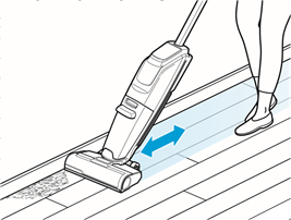 | 1. Tryk på tænd/sluk-knappen for at tænde maskinen. Maskinen starter i tørrengøringstilstand. | 2. Læn maskinen tilbage for at starte børsterullen. Flyt maskinen frem og tilbage for at rengøre gulve. | |