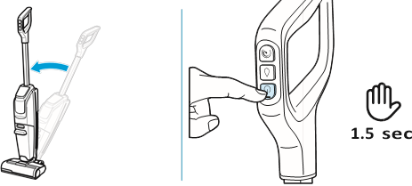 | Skift til Turbo Mode for ekstra sug til større snavs og tæpper. | 3. Sæt maskinen tilbage i opretstående position for at stoppe.