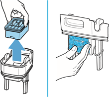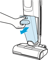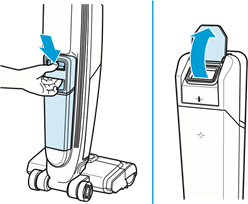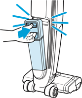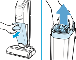 | 1. Tryk på knappen oven på den snavsede tank, og træk den ud. | 2. Fjern toppen af tanken ved at tage fat i låget i det forsænkede område på begge sider af filteret. | 3. Fjern filteret fra låget. Fjern snavs fra filteret og fra lågets maskeskærm. |