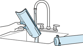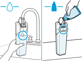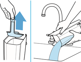 | 1. Fjern rentvandstanken ved at trykke på låsen og vippe tanken bagud. Åbn låget på toppen af tanken. | 2. Fyld med varmt (60 °C MAX) postevand op til påfyldningslinjen. Brug ikke kogende vand. Opvarm ikke vand i mikrobølgeovnen. Tilsæt rengøringsformel til formlens påfyldningslinje. | 3. Luk låget, indtil det klikker, før det installeres i enheden. Sæt bunden af tanken i igen, og vip tanken mod maskinen, indtil den klikker. |