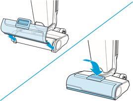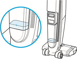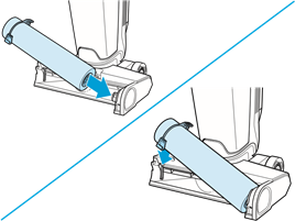 | 7. Udskift låget og sien på snavsetvandstanken, filteret øverst. Sæt bunden af tanken ind i maskinen først. Vip tanken mod maskinen, indtil den klikker på plads. | 8. Indsæt højre side af børsterullen først, og drej nedad, indtil tappen på venstre side af børsten er låst på plads. | 9. Geninstaller vinduet ved at justere fanerne på de nederste kanter af foden og dreje mod maskinen. Tryk ned, indtil vinduet klikker på plads. |