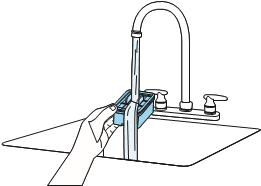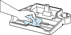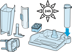 | 4. Vask børsterulle og vindue i hånden med vand og mildt rengøringsmiddel. | 5. Fjern maskinen fra docken for at tørre bakken af. Skyl ikke bakken under vandhanen for at undgå, at der trænger vand ind i opladningsstikket. | 6. Lad alle dele ligge ude at tørre i 24 timer, før de samles igen. |