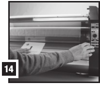 Trin 9: Brug Slow Forward (Langsom frem)-knappen, og tryk og hold, mens du ser filmen trække gennem varme- og trækrullerne, og observer filmen, der kommer ud bag på laminatoren.