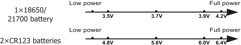 * TURBO-Verfügbarkeit: Der TURBO-Modus ist nur zugänglich bei Verwendung eines wiederaufladbaren 21700/18650 Li-Ionen-Akkus mit einem Entladestrom von über 8A. Er ist nicht zugänglich bei Verwendung von CR123/RCR123-Batterien.