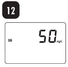 ![]() | Überbereich: Ein blinkender Wert der maximalen Konzentration zeigt einen Überbereichszustand an. Die Konzentration der Probe liegt außerhalb des programmierten Bereichs: Verdünnen Sie die Probe und wiederholen Sie den Test. |