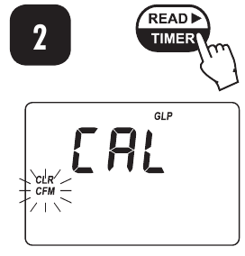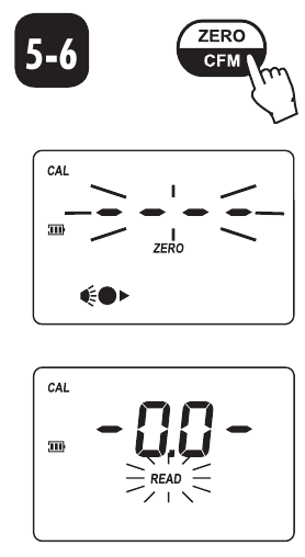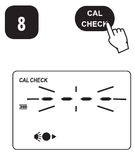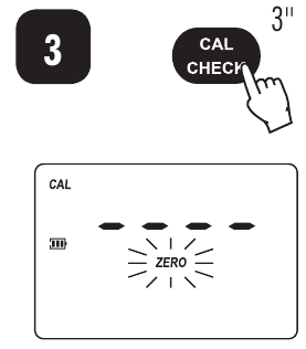 - Halten Sie CAL CHECK (KALIBRIERPRÜFUNG) drei Sekunden lang gedrückt, um in den Kalibrierungsmodus zu gelangen. Während des Kalibriervorgangs zeigt das Display "CAL" (KAL) an. Das blinkende "ZERO" (NULL) fordert zur Nullstellung des Instruments auf.