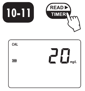 - Nach einigen Sekunden zeigt das Display "-0.0-" an. Das Messgerät ist nun genullt und bereit zur Kalibrierung. Das blinkende "READ" (LESEN) fordert das Ablesen des Kalibrierstandards an.