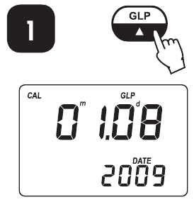 , um in den GLP-Modus zu gelangen. Kalibrierungsmonat und -tag erscheinen auf dem Hauptdisplay und das Jahr auf dem Sekundärdisplay.