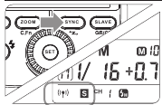 "Sync-Kabelanschluss/S1/S2" (Kurzzeitsynchronisation) einstellen: Drücken Sie die <SYNC>-Taste, um den High-Speed Sync-Blitz zu aktivieren, und das High-Speed-Symbol < > wird angezeigt.