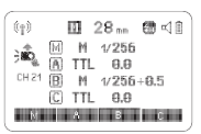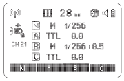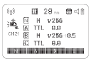 →Überprüfen Sie die eingestellte Blitzausleuchtung. Dieses Blitzgerät bietet eine Blitzausleuchtung zwischen 28 und 105mm, passend für Mittelformatkameras.