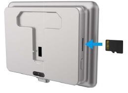 - Legen Sie die Micro SD-Karte (separat erhältlich) wie in der Abbildung unten gezeigt in den Kartensteckplatz ein.
