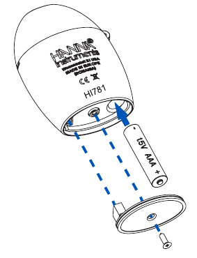 Um die Batterie zu schonen, schaltet sich der Checker nach 20 Minuten Inaktivität und 4 Minuten nach einer Messung aus. Eine frische Batterie reicht für mindestens 5000 Messungen. Wenn die Batterie leer ist, zeigt das Instrument "bAd" (schlecht) und dann "bAt" (Batterie) an und schaltet sich aus. Um die Batterie zu wechseln, befolgen Sie die nächsten Schritte: