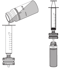 - Entfernen Sie die Kappe vom Mischfläschchen. Halten Sie die Spritze und die Filterhalterung über eine Küvette. Gießen Sie den Inhalt des Mischfläschchens vorsichtig in die Rückseite der Spritze.