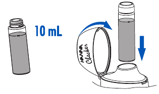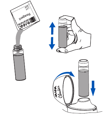 - Entfernen Sie die Küvette, schrauben Sie die Kappe ab und geben Sie den Inhalt eines Päckchens HI781C-0 Reagenz hinzu. Setzen Sie die Kappe wieder auf und schütteln Sie kräftig für 2 Minuten.