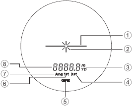 : Erscheint, während der Laser für eine Messung ausgestrahlt wird. Schauen Sie nicht in Richtung der Objektivlinse, solange diese Markierung angezeigt wird. - Maßeinheit (m: Meter/YD: Yard)
