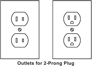 - Doppelt isolierte Werkzeuge können in beiden in der vorhergehenden Abbildung gezeigten 120-Volt-Steckdosen verwendet werden. (Siehe Steckdosen für zweipoligen Stecker.)