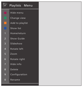 Dieses Menü-Overlay zeigt Ihre Optionen, wenn PHOTO aktiviert ist. Drücken Sie die rote Taste, um das Overlay aufzurufen.