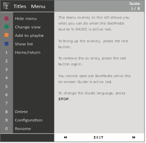 Das Menü-Overlay zeigt die Optionen, die Sie mit jeder BeoMedia-Quelle haben – Sobald das Overlay angezeigt wird, drücken Sie die entsprechende Taste, um die Funktion auszuwählen, die Sie aktivieren möchten.