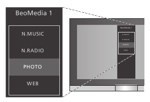 | Wenn BeoMedia aktiviert ist, wird die Liste der Quellen auf dem Bildschirm angezeigt, wie rechts gezeigt Verwenden Sie die Pfeiltasten, um die gewünschte BeoMedia-Quelle hervorzuheben. Drücken Sie dann GO (Starten) | ![]() GO |