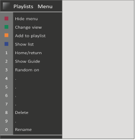 Dieses Menü-Overlay zeigt Ihre Optionen, wenn N.MUSIC aktiviert ist. Drücken Sie die rote Taste, um das Overlay aufzurufen.